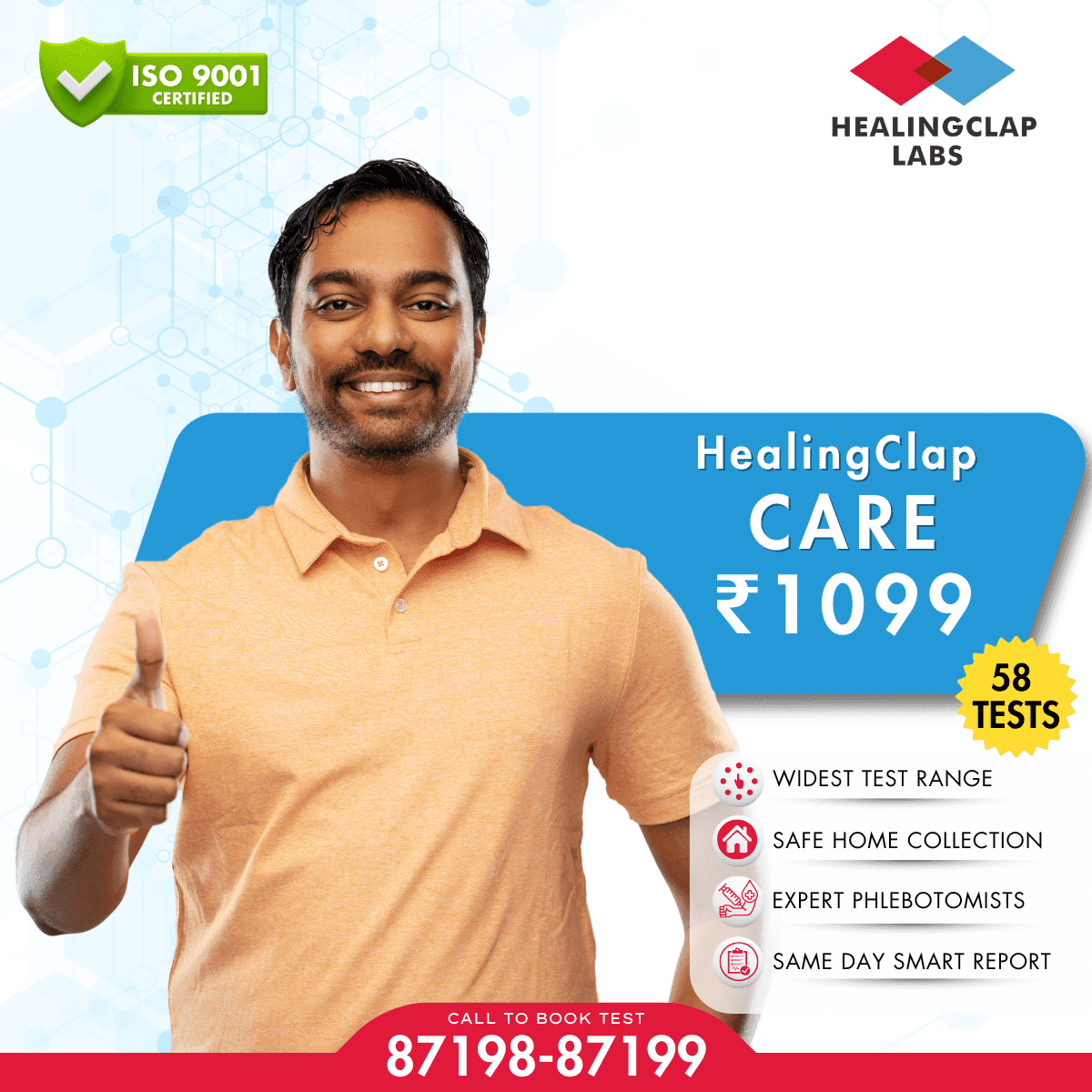 HealingClap CARE’s price is ₹999. Our representatives will gladly guide you through all the available packages, their test parameters and booking appointments. Call 87198-87199.